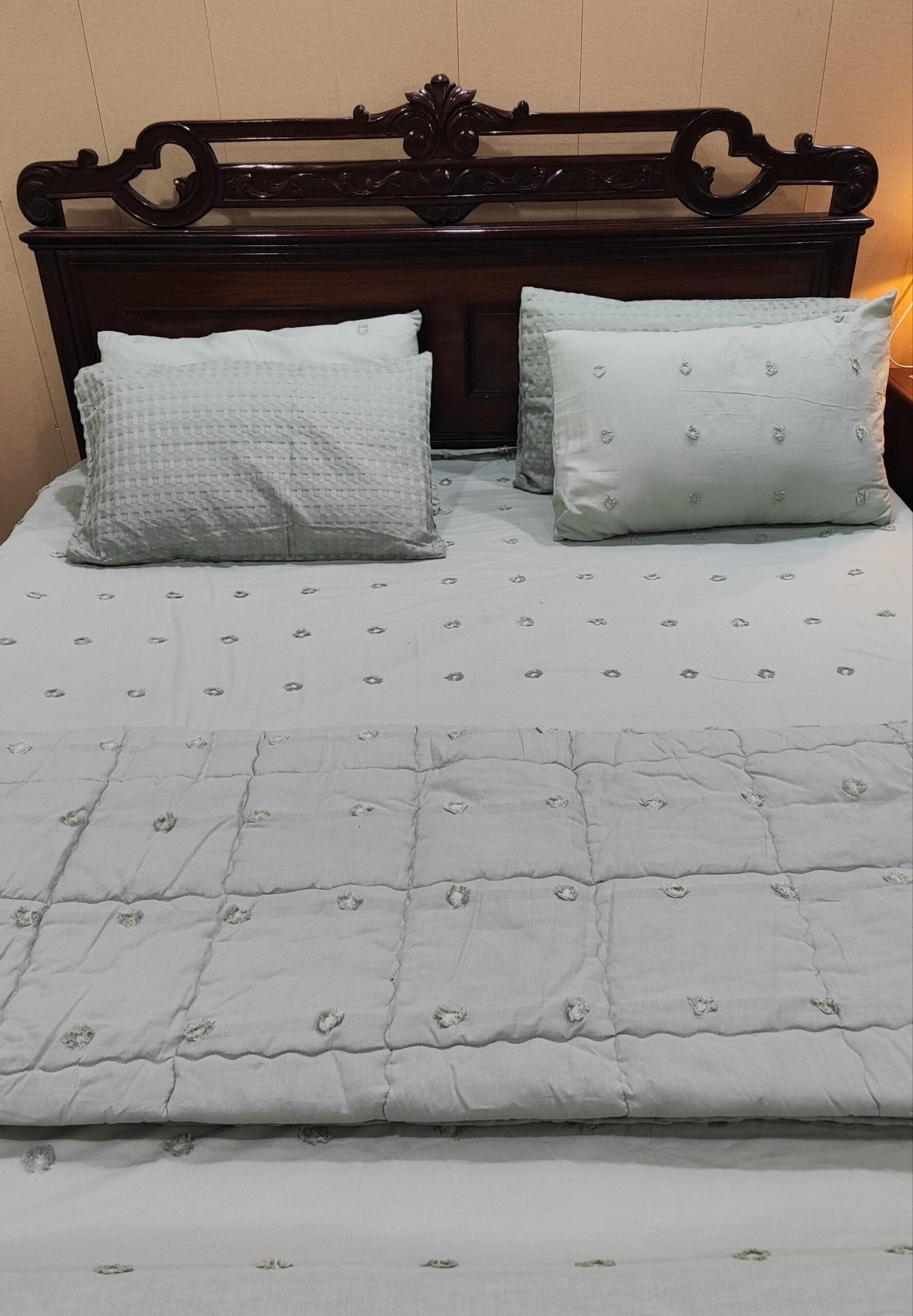 Design: A calming, pale sage green palette elevated by delicate, tactile tufted thread dots and a cozy square-quilted pattern on the comforter.