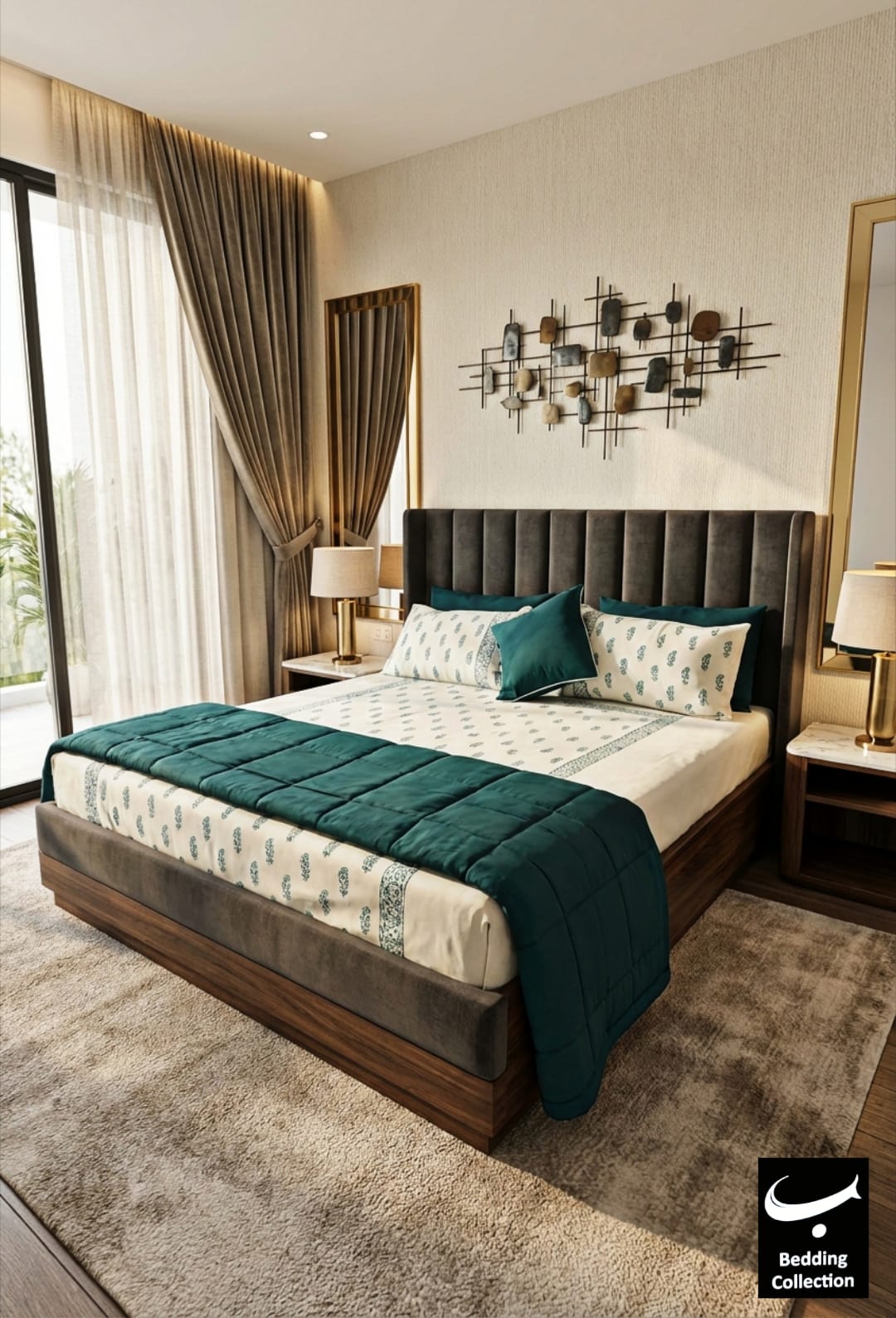 • Color Palette: Cream/Beige, Emerald Green, Teal