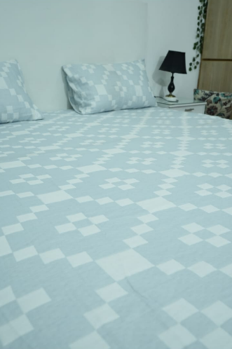 Cool, Calm & Contemporary Create a soothing atmosphere in your bedroom with our Powder Blue & White Geometric Bed Sheet Set. This fresh design features a modern, pixel-style geometric pattern in soft white against a calming light blue background. It’s the perfect choice for minimalists or anyone looking to add a touch of cool, serene color to their space without the visual clutter of a heavy print.