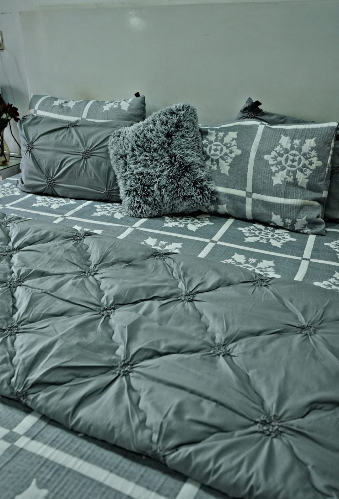 Elegant Texture & Cozy Warmth Redefine luxury with our Slate Grey Pintuck Comforter Set. This sophisticated collection features a timeless pinch-pleat (pintuck) design on the comforter and shams, creating a rich, dimensional texture that instantly elevates your bedroom decor. The solid grey tones provide a calming, modern backdrop, while the patterned bedsheet adds a unique touch of character with its geometric snowflake-style grid print.