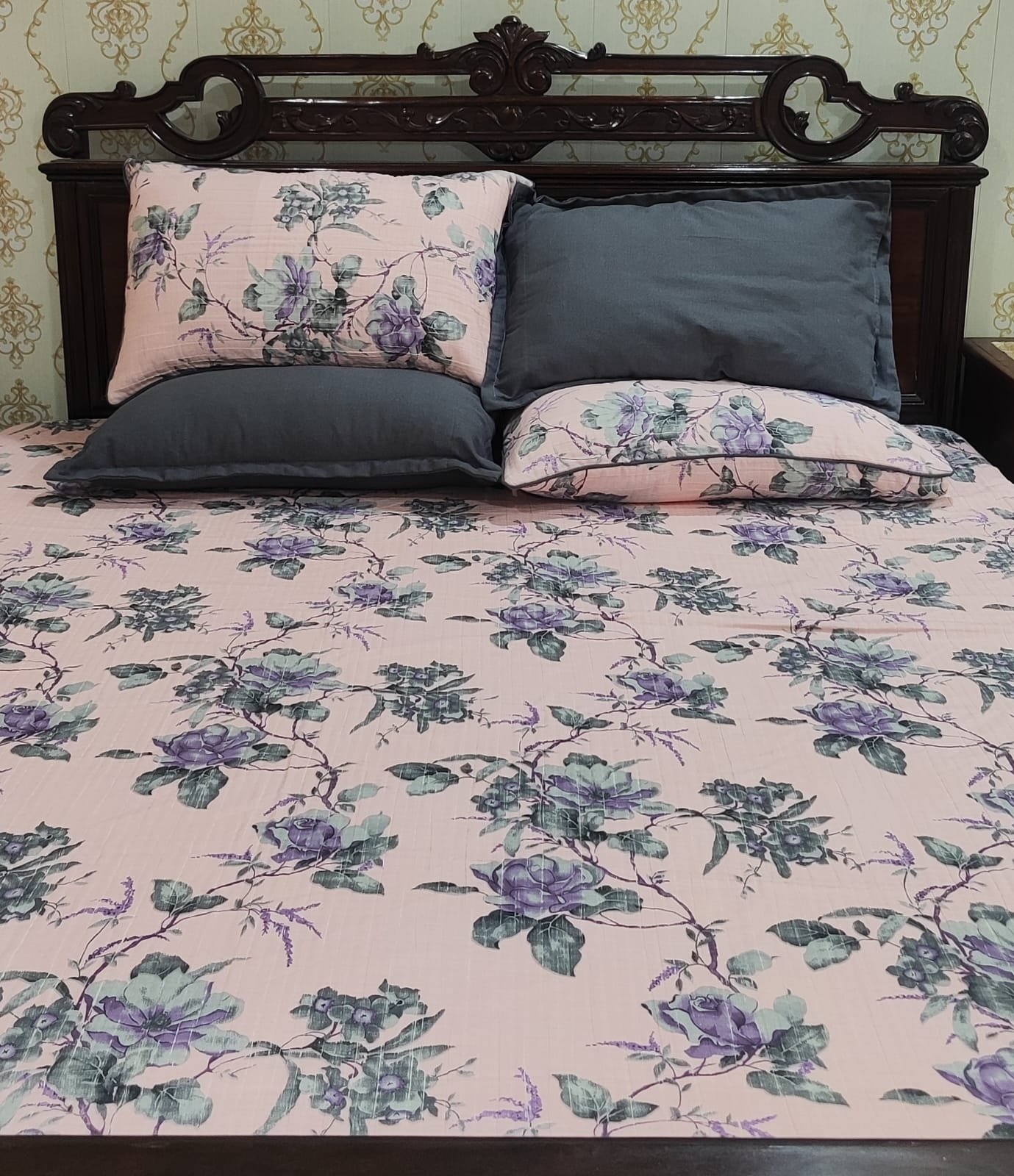 Bring a touch of classic romance to your bedroom with our Vintage Rose Elegance Bedsheet Set. Featuring a beautiful arrangement of soft purple and grey florals against a blush pink background, this complete 7-piece set includes everything you need for a perfectly styled bed. Limited Time Offer: Rs. 7,000 (Regularly Rs. 8,500).